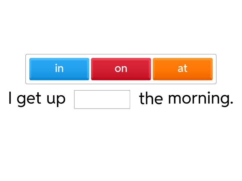 I get up ____ the morning. My friend does her homework ____ the evening. We play football ____ schooldays. Adam watches TV ____ the weekend. Do you play computer games ____ night? We go to school ____ day. ____ time do you go to bed? My mum has dinner ____ the afternoon. He plays board games ____ Friday.