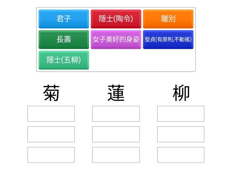 菊: 堅貞(有原則,不動搖), 長壽, 隱士(陶令), 蓮: 君子, 柳: 隱士(五柳), 離別, 女子美好的身姿,