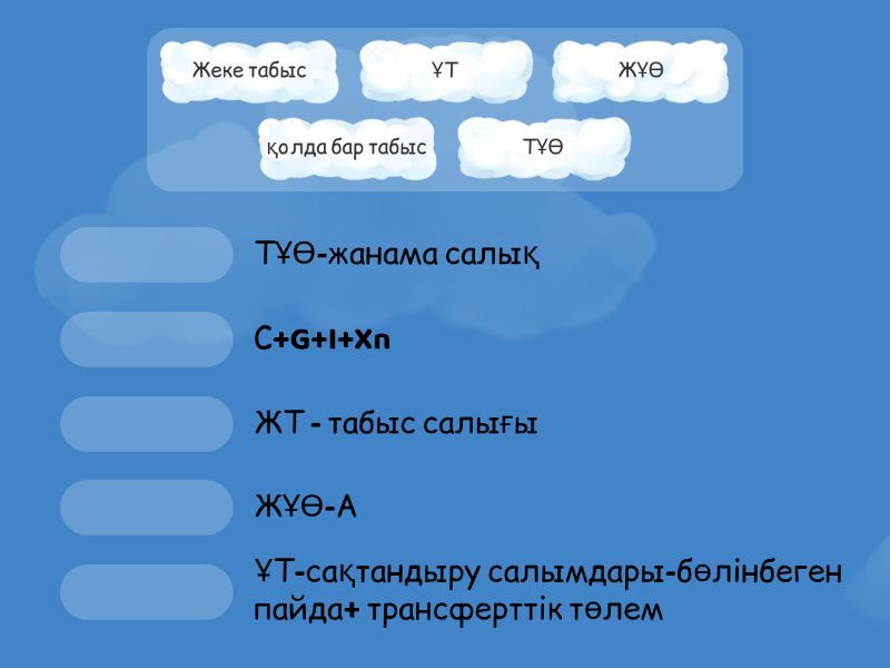ЖҰӨ - С+G+I+Xn, ТҰӨ - ЖҰӨ-А, ҰТ - ТҰӨ-жанама салық, Жеке табыс - ҰТ-сақтандыру салымдары-бөлінбеген пайда+ трансферттік төлем, қолда бар табыс - ЖТ - табыс салығы,