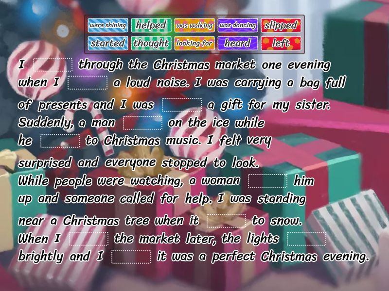 I ____ through the Christmas market one evening when I ____ a loud noise. I was carrying a bag full of presents and I was ____ a gift for my sister. Suddenly, a man ____ on the ice while he ____ to Christmas music. I felt very surprised and everyone stopped to look. While people were watching, a woman ____ him up and someone called for help. I was standing near a Christmas tree when it ____ to snow. When I ____ the market later, the lights ____ brightly and I ____ it was a perfect Christmas evening.