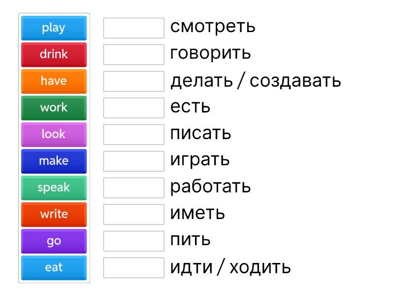 be - быть, have - иметь, do - делать, say - говорить / сказать, go - идти / ходить, come - приходить, make - делать / создавать, take - брать, give - давать, get - получать, see - видеть, look - смотреть, hear - слышать, listen - слушать, eat - есть, drink - пить, cook - готовить, sleep - спать, wake up - просыпаться, work - работать, study - учиться / изучать, learn - учить / изучать, read - читать, write - писать, speak - говорить, talk - разговаривать, ask - спрашивать, answer - отвечать, help - помогать, play - играть,