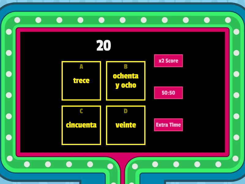 1) 20 a) trece b) ochenta y ocho   c) cincuenta d) veinte 2) 13 a) ochenta y ocho   b) quince c) trece d) cero 3) 100 a) quince b) cien c) cincuenta d) cero 4) 0 a) cero b) cuarenta y dos c) cien d) nueve 5) 50 a) cincuenta b) cien c) sesenta y uno d) cero 6) 88 a) quince b) veinte c) ochenta y ocho   d) trece 7) 42 a) cuarenta y dos b) ochenta y ocho   c) cien d) trece 8) 15 a) trece b) quince c) cien d) veinte 9) 61 a) nueve b) sesenta y uno c) trece d) cien 10) 9 a) ochenta y ocho   b) nueve c) sesenta y uno d) cero 11) 15 a) quince b) cinco c) cincuenta d) seis 12) 33 a) treinta y tres b) tres y tres c) trece d) tres