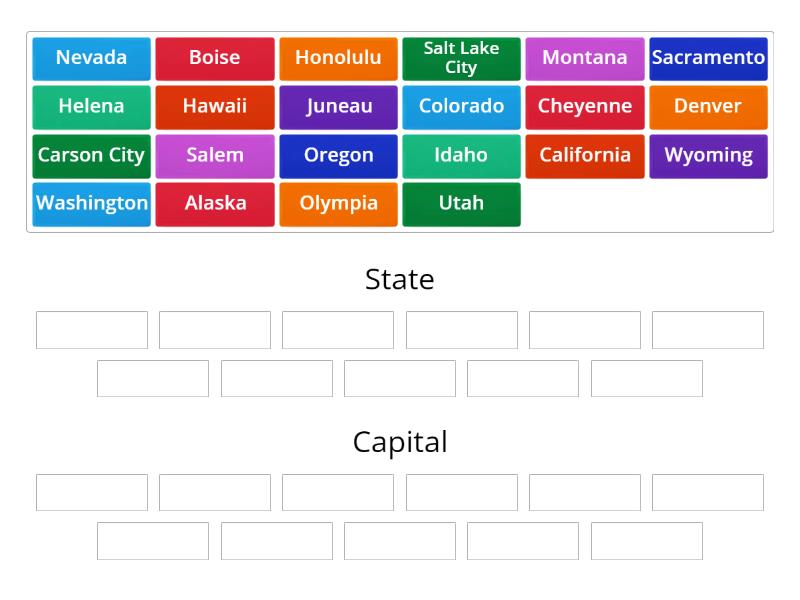 State: California, Hawaii, Alaska, Wyoming, Colorado, Utah, Nevada, Washington, Oregon, Montana, Idaho, Capital: Helena, Juneau, Honolulu, Salem, Olympia, Sacramento, Carson City, Salt Lake City, Denver, Cheyenne, Boise,