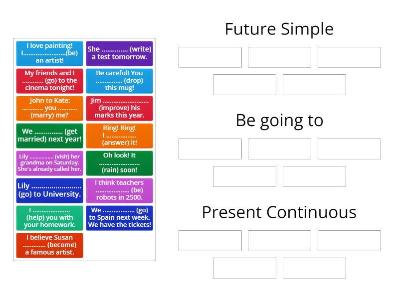 Future Simple: I ..................... (help) you with your homework., Ring! Ring! I ................. (answer) it!, I think teachers ................... (be) robots in 2500., I believe Susan ............. (become) a famous artist., John to Kate: ............ you ........... (marry) me?, Be going to: Oh look! It ....................... (rain) soon!, Be careful! You ............... (drop) this mug!, Jim .......................... (improve) his marks this year., Lily ......................... (go) to University., I love painting! I........................(be) an artist!, Present Continuous: We .................. (go) to Spain next week. We have the tickets!, Lily ................ (visit) her grandma on Saturday. She's already called her., My friends and I ............ (go) to the cinema tonight!, We ............... (get married) next year!, She .............. (write) a test tomorrow.,
