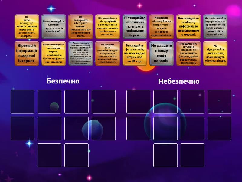 Безпечно: Не давайте нікому своїх паролів., Відмовляйтеся від зустрічей з випадковими людьми, з якими знайомилися в онлайні., Не скачуйте та не створюйте невідомі програми для посилань, навіть якщо вони будуть надані друзям., Не відкривайте листи-спам, вони можуть містити віруси., Не повідомляйте інформацію про кредити батьків (номер картки, термін дії та таємний код)., Повідомте про ситуації в інтернеті, які вас не знають (погрози, файли певного місту, пропозиції)., Не поширюйте в Інтернеті контент незаконного або непристойного змісту., Не вірте всьому, що читаєте - завжди перевіряйте достовірність джерела., Використовуйте надійний пароль - комбінуйте букви, цифри та інші символи., Вашим друзям слід питати вашого дозволу, перш ніж завантажувати фотографії з вами або позначати вас на фотографіях в соціальних мережах. Не бійтеся сказати їм про це, і самі теж дотримуйтесь цього правила, Небезпечно: Негативно відписуйте на непристоїнні та грубі коментарі, адресовані вам., Викладайте фото квітків, на яких видно штрих-код чи QR-код., Відтворюйте небезпечні челенджі з соціальних мереж., Розповідайте особисту інформацію незнайомцям у мережі., Використовуйте однакові паролі для всіх членів сім'ї., Вірте всій інформації в мережі інтернет.,