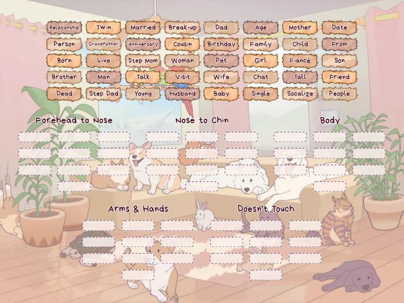Forehead to Nose: Brother, Dad, Grandfather, Man, Step Dad, Son, Husband, Nose to Chin: Mother, Talk, Birthday, Girl, Woman, Step Mom, Wife, Age, Twin, Single, Body: Young, Live, Born, Arms & Hands: Family , Friend, From, Fiancé, Date, Relationship , Baby, Married, Pet, Break-up, Doesn't Touch : Child, Person, Cousin, Tall, Socalize, Visit, People, Anniversary , Dead, Chat,