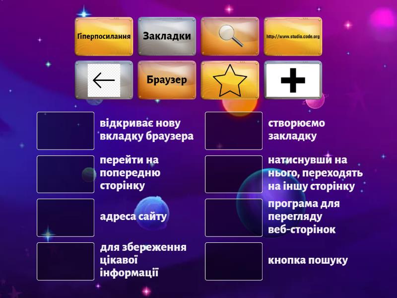 Гіперпосилання - натиснувши на нього, переходять на іншу сторінку, Браузер - програма для перегляду веб-сторінок, Закладки - для збереження цікавої інформації, відкриває нову вкладку браузера, перейти на попередню сторінку, кнопка пошуку, створюємо закладку, http://www.studio.code.org - адреса сайту,