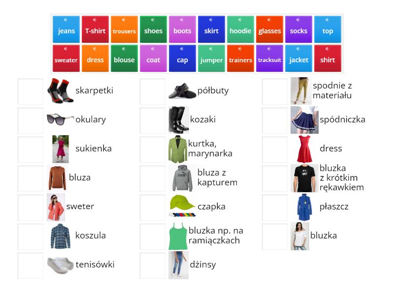 shoes - półbuty, cap - czapka, trousers - spodnie z materiału, shirt - koszula, trainers - tenisówki, jeans - dżinsy, T-shirt - bluzka z krótkim rękawkiem, boots - kozaki, hoodie - bluza z kapturem, skirt - spódniczka, coat - płaszcz, tracksuit - dress, jacket - kurtka, marynarka, dress - sukienka, jumper - bluza, top - bluzka np. na ramiączkach, sweater - sweter, socks - skarpetki, blouse - bluzka, glasses - okulary,