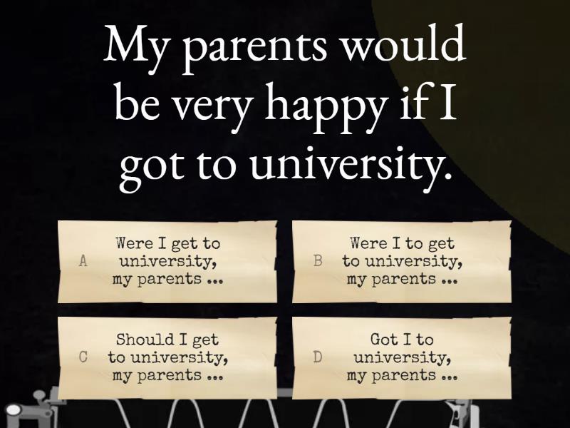 1) My parents would be very happy if I got to university. a) Were I get to university, my parents ... b) Were I to get to university, my parents ... c) Should I get to university, my parents ... d) Got I to university, my parents ... 2) If I hadn’t taken out a loan, I wouldn’t have redecorated the flat. a) Hadn't I taken out ..., I wouldn't ... b) Were I not to take out a loan, I wouldn't... c) Had I not taken out ..., I wouldn't ... 3) If I didn’t have a broken leg, I could drive to work. a) Were it not for my broken leg, I could ... b) Had it not been for my broken leg, I could ... c) But for my broken leg, I could ... d) If it weren't for my broken leg, I could ... e) If it hadn't been for my broken leg, I could... 4) If I lose my job, I’ll have to give up my studies. a) Were I to lose my job, I'll have ... b) Should I lose my job, I'll ... c) But for my job, I'll ... d) Unless I lose my job, I'll have to ... 5) If I hadn’t sold my old car, I wouldn’t have had the money to buy a new one. a) Hadn't I sold ..., I wouldn't have ... b) Had I not sold ..., I wouldn't have ... c) If I were to sell my car, ... 6) I can’t get a job because of high unemployment. a) Should the unemployment not be so high, I will get ... b) Were it not for high unemployment, I could ... c) Were unemployment not to be high, ... 7) We didn't know about the bed bugs - that's why we gave you this room. a) Should we know about ..., we wouldn't give ... b) Were we not to know about ..., we wouldn't give ... c) Had we not known ..., we wouldn't have given ... 8) If there is a problem with your order, please contact customer services. a) Should there be ..., please ... b) Were there to be ..., please ... c) Had there been ..., ... 9) We didn't have a lot of time, so we didn't stay there all day. a) Were we to have more time, we would stay... b) Had we had more time, we would stay ... c) Had we had more time, we would have stayed ... 10) If he apologises tomorrow, I won’t accept it. a) Should he apologize tomorrow, I won't ... b) Were you to apologize tomorrow, I won't ... c) Unless he apologizes tomorrow, I will ...