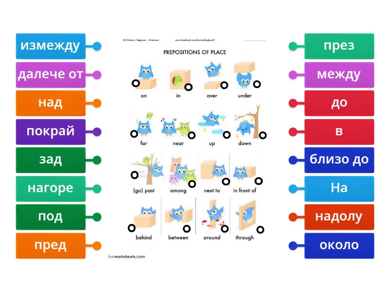На, в, над, под, далече от, близо до, нагоре, надолу, покрай, измежду, до, пред, зад, между, около, през.