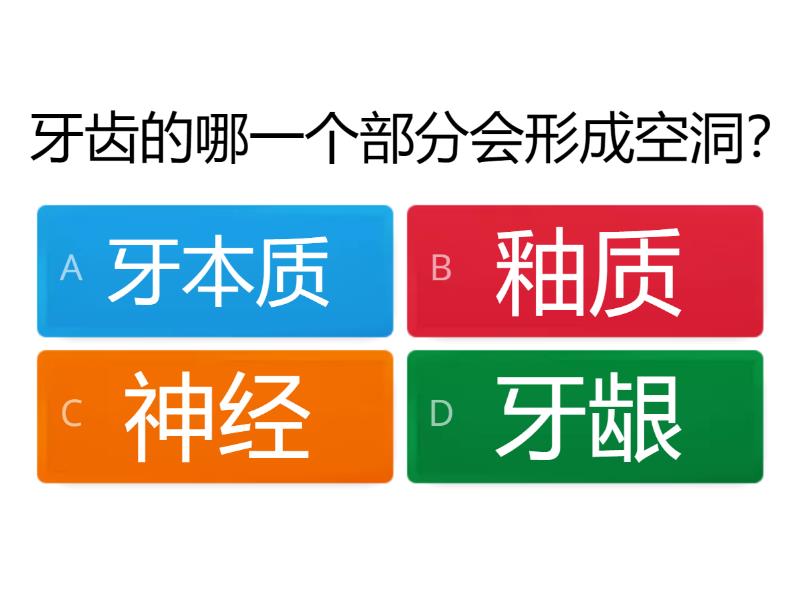 1) 牙齿的哪一个部分会形成空洞? a) 牙本质 b) 釉质 c) 神经 d) 牙龈 2) 进食后,什么东西会遗留在我们的牙缝? a) 牛奶 b) 汽水 c) 食物残渣 d) 口香糖 3) 哪种食物对牙齿有害? a) 水果 b) 蔬菜 c) 汽水 d) 牛奶 4) 什么东西会分解牙齿上的食物残渣? a) 细菌 b) 牙本质 c) 釉质 d) 酸性物质 5) 当细菌把食物残渣分解时,细菌会产生什么东西? a) 碱性物质 b) 坚硬物质 c) 酸性物质 d) 中性物质 6) 酸性物质会破坏牙齿的哪一个部分? a) 牙龈 b) 釉质 c) 牙本质 d) 血管 7) 牙齿的表面被破坏后,就会出现什么? a) 食物残渣 b) 空洞 8) 以下哪一项是蛀牙形成的过程排列? a) P, T, Q, S, R b) Q , S, P, T, R c) Q, S, T, P, R d) Q, T, S, P, R