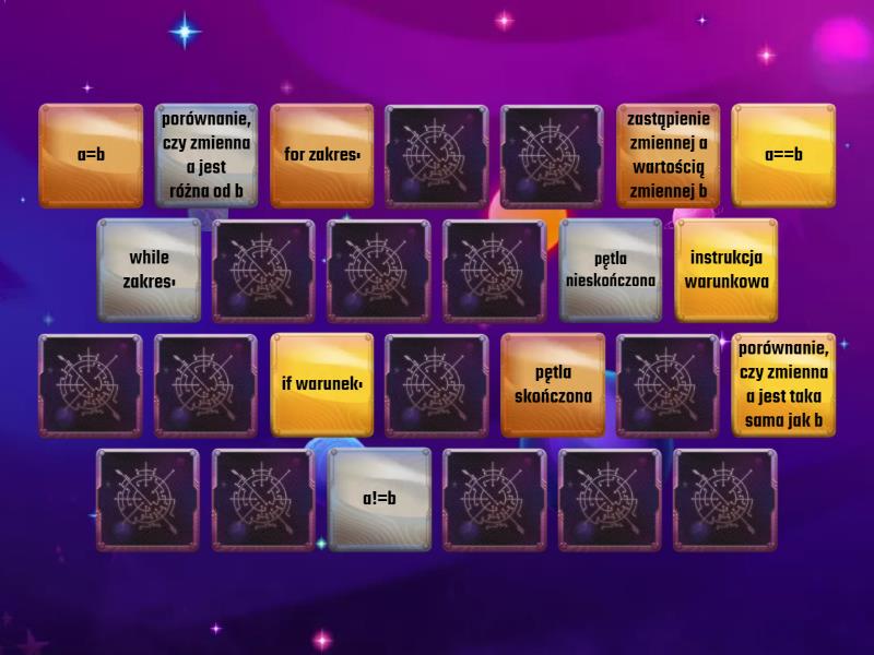 a==b - porównanie, czy zmienna a jest taka sama jak b, a!=b - porównanie, czy zmienna a jest różna od b, a=b - zastąpienie zmiennej a wartością zmiennej b, if warunek: - instrukcja warunkowa, while zakres: - pętla nieskończona, for zakres: - pętla skończona, print("wyraz") - wyświetla słowo wyraz, print(a) - wyświetla liczbę a, input() - wprowadza dane wejściowe z klawiatury, int(a) - zmienia a na liczbę całkowitą, float(a) - zmienia a na liczbę zmiennoprzecinkową, tryb skryptowy - piszesz kod, który zapiszesz do pliku, tryb interaktywny - kod wykonywany jest na bieżąco,