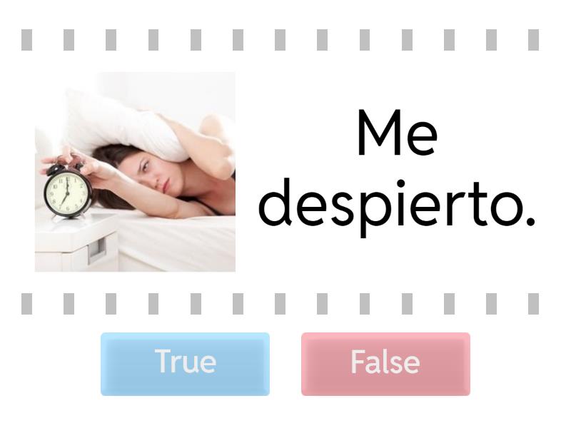True: Me despierto., Me lavo la cara., Me afeito., Me baño. , Me ducho., Me acuesto., el peine, el cinturón, False: Me cepillo el pelo., Me cepillo los dientes., Me seco., Me pongo la ropa., Me pinto las uñas. , el secador, el maquillaje, las joyas,