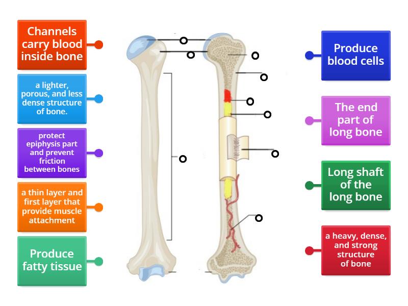 a lighter, porous, and less dense structure of bone., a heavy, dense, and strong structure of bone, a thin layer and first layer that provide muscle attachment, Long shaft of the long bone, The end part of long bone, Produce blood cells, Produce fatty tissue, Channels carry blood inside bone, protect epiphysis part and prevent friction between bones.