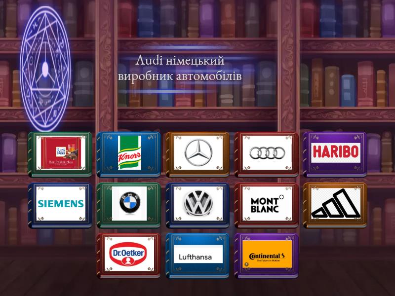 Audi німецький виробник автомобілів , BMW торгова марка автомобілів і мотоциклів , Mercedes-Benz німецька торгова марка транспортних засобів, Volkswagen німецька автобудівна фірма, Торгова марка, що випускає супи, приправи, соуси , Випускає фруктовий мармелад, лакрицю, зефір, жувальні цукерки, Німецька транснаціональна компанія, яка виробляє розпушувачі, суміші для тортів, заморожену піцу, пудинги..., Німецька торгова марка шоколаду, Німецька компанія, один зі світових лідерів виробництва спортивних товарів, Німецька компанія, яка спеціалізується на продажу великої побутової техніки, Найбільша німецька авіакомпанія, Німецький виробник шин і автокомпонентів, Головним продуктом компанії стала модель Montblanc – ручка з білим наконечником із вже фірмовою шестикутною зіркою,