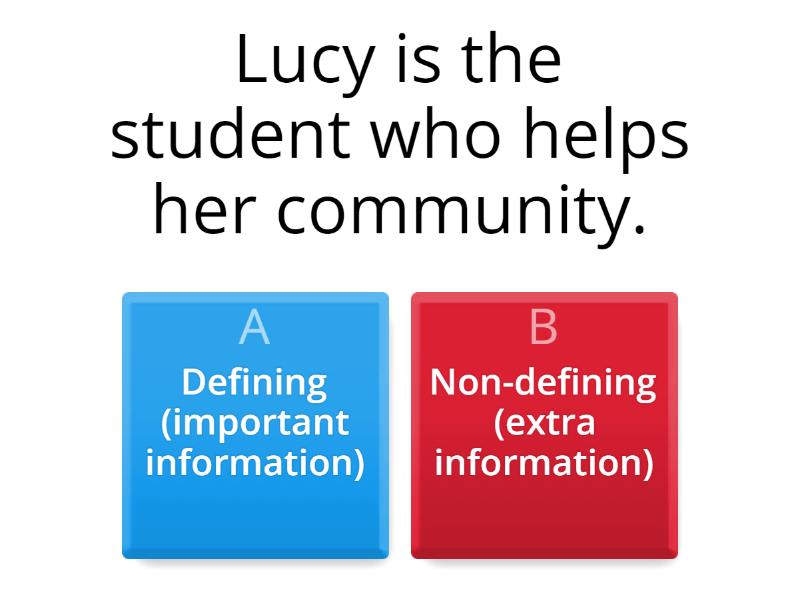 1) Lucy is the student who helps her community. a) Defining (important information) b) Non-defining (extra information) 2) The woman who lives next door likes to take long walks. a) Defining (important information) b) Non-defining (extra information) 3) My older brother Ben, who lives in Paris, speaks French. a) Defining (important information) b) Non-defining (extra information) 4) Owen worked for the company which produced glass bottles. a) Defining (important information) b) Non-defining (extra information) 5) We know a lot of people who recycle. a) Defining (important information) b) Non-defining (extra information) 6) Michael told me about his new project, which he is enjoying. a) Defining (important information) b) Non-defining (extra information) 7) We vacationed at the hotel by that small lake, which one of our friends recommended. a) Defining (important information) b) Non-defining (extra information) 8) A Londoner is someone who lives in London. a) Defining (important information) b) Non-defining (extra information) 9) Your teacher, who is leading this lesson, can speak English well. a) Defining (important information) b) Non-defining (extra information) 10) This afternoon I found my hairbrush, which I had been missing for two weeks. a) Defining (important information) b) Non-defining (extra information) 11) What was the name of the person who picked up litter? a) Defining (important information) b) Non-defining (extra information) 12) Where is the book that we used last year? a) Defining (important information) b) Non-defining (extra information) 13) I have visited New York, where I grew up. a) Defining (important information) b) Non-defining (extra information) 14) The new book, which we will start soon, has got an amazing song in Unit 1. a) Defining (important information) b) Non-defining (extra information) 15) I don’t want to live in a city that has no access to the sea. a) Defining (important information) b) Non-defining (extra information)