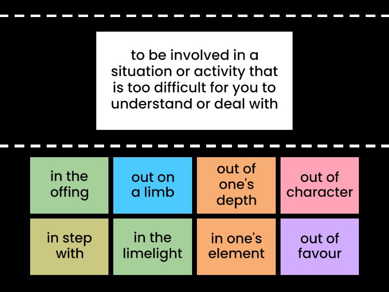 out of one's depth - to be involved in a situation or activity that is too difficult for you to understand or deal with, in the limelight - in a situation in which someone receives a lot of attention, especially from newspapers, television etc, out on a limb - alone and without help or support, in step with - having ideas or actions that are like those of other people, out of character - untypical of someone’s character, out of favour - when someone or something is not liked or approved of by people, in one's element - to be in a situation that you enjoy, because you are good at it, in the offing - to be likely to happen soon,