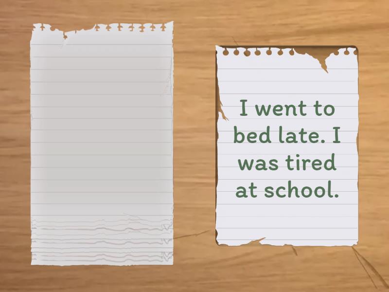 Tom didn't catch the train. He was late., I went to bed late. I was tired at school., The dress was expensive. I didn't buy it., I ate too much. I felt sick., I took medicine. I felt better., I didn't save money. I wasn't able to buy a tablet., I wasn't hungry. I didn't eat lunch., You didn't look at the departure board. You didn't know where to go., I didn't have time. I didn't go to John's party., I studied a lot. I passed all my exams., My friend failed his exams. He didn't study enough., The weather wasn't nice. We stayed at home..