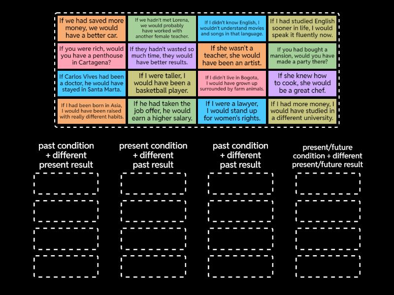 past condition + different present result: If I had studied English sooner in life, I would speak it fluently now., If he had taken the job offer, he would earn a higher salary., If we had saved more money, we would have a better car., If they hadn't wasted so much time, they would have better results., present condition + different past result: If I didn't live in Bogota, I would have grown up surrounded by farm animals., If I had more money, I would have studied in a different university., If I were taller, I would have been a basketball player., If she wasn't a teacher, she would have been an artist., past condition + different past result: If I had been born in Asia, I would have been raised with really different habits., If you had bought a mansion, would you have made a party there?, If we hadn't met Lorena, we would probably have worked with another female teacher., If Carlos Vives had been a doctor, he would have stayed in Santa Marta., present/future condition + different present/future result: If I were a lawyer, I would stand up for women's rights., If I didn't know English, I wouldn't understand movies and songs in that language., If she knew how to cook, she would be a great chef., If you were rich, would you have a penthouse in Cartagena?,