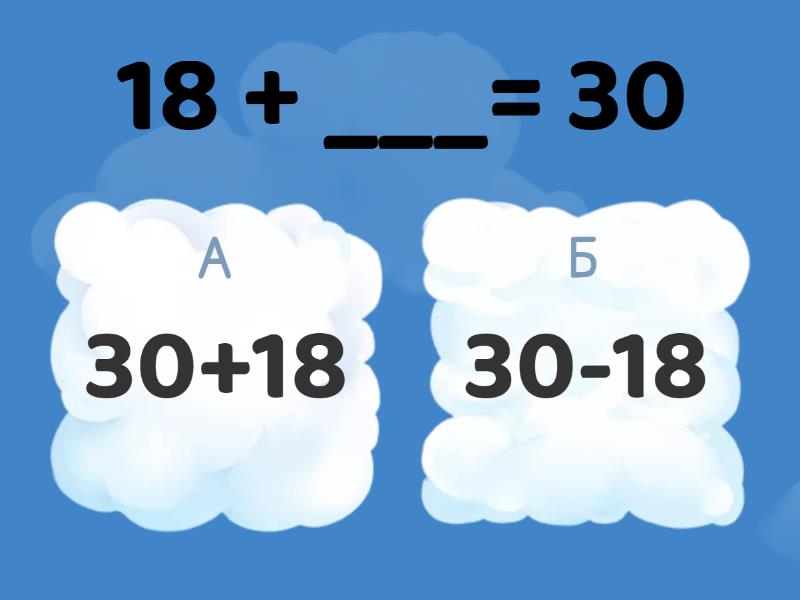 1) 18 + ___= 30 a) 30+18 b) 30-18 2) ____+ 13 = 17 a) 17-13 b) 17+13 3) 6 + __= 14 a) 14+6 b) 14-6 4) ___– 41 = 53 a) 53-41 b) 53+41 5) ___– 7 = 21 a) 21-7 b) 21+7 6) ___– 17 = 37 a) 37-17 b) 37+17