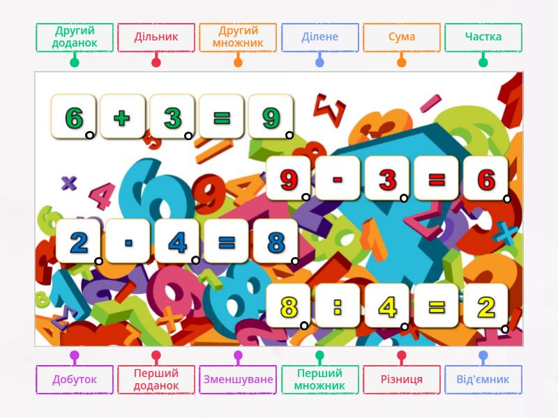 Перший доданок, Другий доданок, Сума, Зменшуване, Від'ємник, Різниця, Перший множник, Другий множник, Добуток, Ділене, Дільник, Частка.