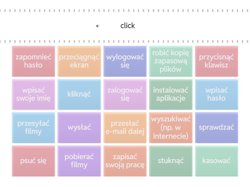 kliknąć - click, przycisnąć klawisz - press a key, przeciągnąć ekran - swipe a screen, stuknąć - tap, wpisać swoje imię - type your name, sprawdzać - check, kasować - delete, wyszukiwać (np. w internecie) - do searches, pobierać filmy - download videos, wpisać hasło - enter your password, zapomnieć hasło - forget your password, przesłać e-mail dalej - forward an email, instalować aplikacje - install apps, zalogować się - log in, wylogować się - log out, robić kopię zapasową plików - make backups of your files, zapisać swoją pracę - save your work, wysłać - send, przesyłać filmy - upload videos, psuć się - break,