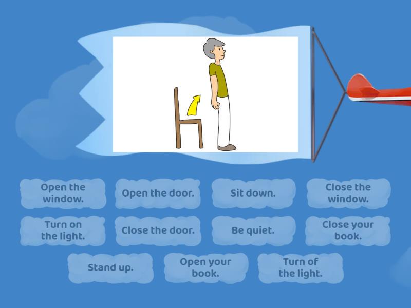 Stand up., Sit down., Open the door., Close the door., Open your book., Close your book., Open the window., Close the window., Turn on the light., Turn of the light., Be quiet.,