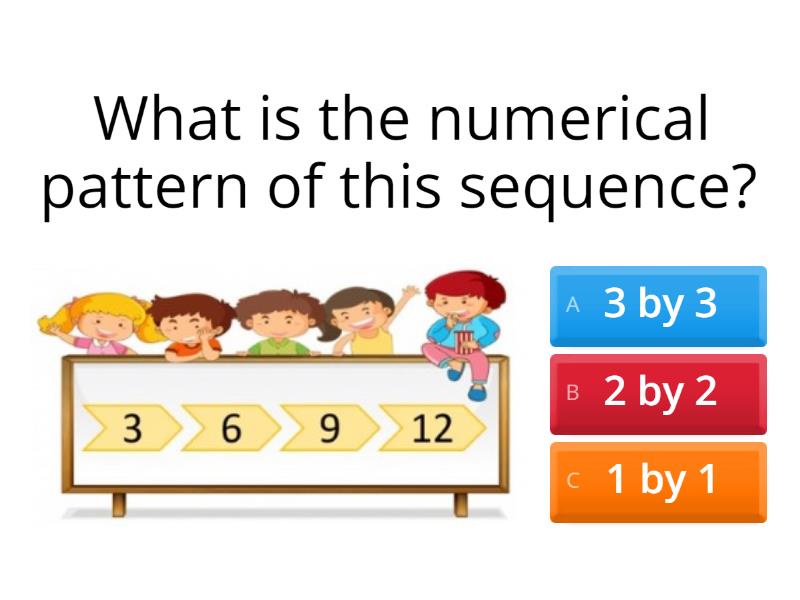 1) What is the numerical pattern of this sequence? a) 3 by 3 b) 2 by 2 c) 1 by 1 2) How long is the numerical sequence? 5 - 10 - 15 - 20 - 25? a) 4 by 4 b) 10 by 10 c) 5 by 5 3) What is the numerical pattern of this sequence? a) Increase by 2 by 2 b) Increase by 5 by 5 c) Decreases by 2 by 2 4) How long is the number sequence 10 - 20 - 30 - 40? a) 3 by 3 b) 10 by 10 c) 8 by 8 5) What is the numerical pattern of this sequence? a) Increase by 2 by 2 b) Increase by 4 by 4 c) Increase by 3 by 3 6) Which of these number sequences corresponds to a pattern of 4 by 4? a) 8 - 12 - 16-20 b) 20 - 15 - 12 - 9 c) 3 - 7 - 10 - 14 7) Which of these number sequences corresponds to a backwards 3 by 3 pattern? a) 6- 9 - 12 - 15 b) 11 - 12 - 13 - 14 c) 3 - 6 - 8 - 10 8) What is the pattern in this number sequence 12 - 10 - 8- 6? a) Increase by 3 by 3 b) Decreases by 2 by 2 c) Decreases by 5 by 5