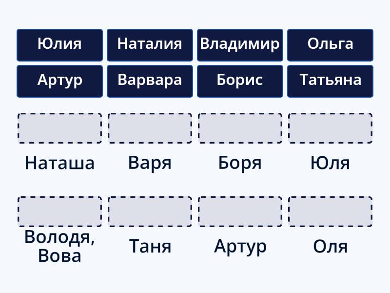 Ольга - Оля, Борис - Боря, Артур - Артур, Владимир - Володя, Вова, Татьяна - Таня, Наталия - Наташа, Юлия - Юля, Варвара - Варя,