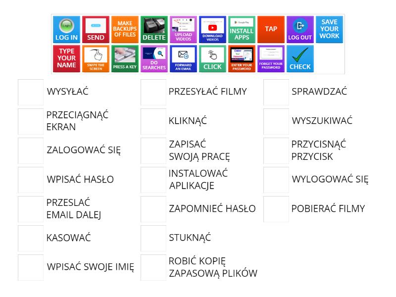CLICK - KLIKNĄĆ, PRESS A KEY - PRZYCISNĄĆ PRZYCISK, SWIPE THE SCREEN - PRZECIĄGNĄĆ EKRAN, TAP - STUKNĄĆ, TYPE YOUR NAME - WPISAĆ SWOJE IMIĘ, CHECK - SPRAWDZAĆ, DELETE - KASOWAĆ, DO SEARCHES - WYSZUKIWAĆ, DOWNLOAD VIDEOS - POBIERAĆ FILMY, ENTER YOUR PASSWORD - WPISAĆ HASŁO, FORGET YOUR PASSWORD - ZAPOMNIEĆ HASŁO, FORWARD AN EMAIL - PRZESLAĆ EMAIL DALEJ, INSTALL APPS - INSTALOWAĆ APLIKACJE, LOG IN - ZALOGOWAĆ SIĘ, LOG OUT - WYLOGOWAĆ SIĘ, MAKE BACKUPS OF FILES - ROBIĆ KOPIĘ ZAPASOWĄ PLIKÓW, SAVE YOUR WORK - ZAPISAĆ SWOJĄ PRACĘ, SEND - WYSYŁAĆ, UPLOAD VIDEOS - PRZESYŁAĆ FILMY ,