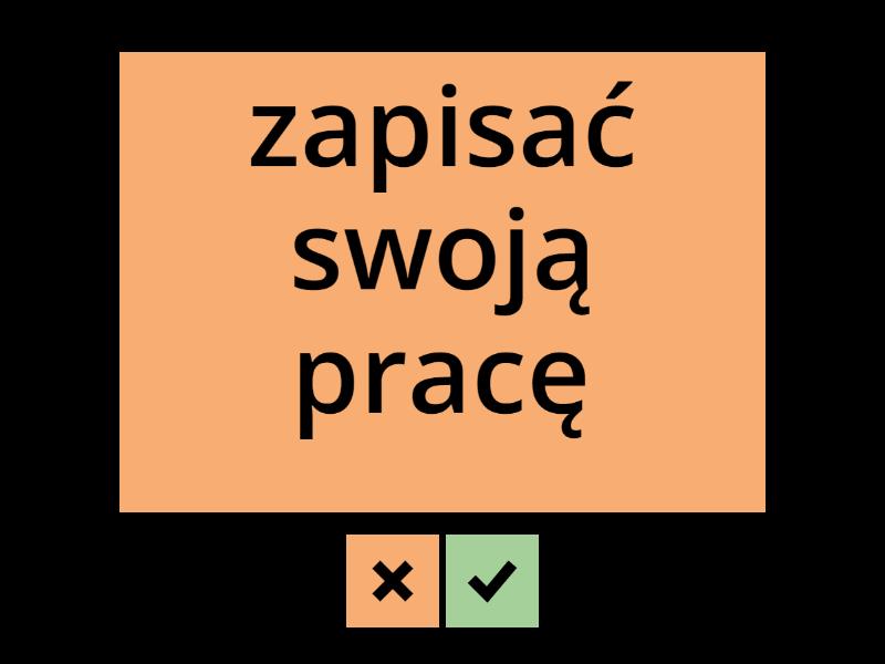 kliknąć - click, przycisnąć klawisz - press a key, przeciągnąć ekran - swipe the screen, stuknąć tap - tap, wpisywać swoje imię - type your name, sprawdza ć - check, kasować - delete, wyszukiwać - do searches, pobierać filmy - download videos, wpisać hasło - enter your password, zapomnieć hasło - forget your password, przesłać email dalej - forward an email, instalować aplikacje - install apps, zalogować się - log in, wylogować się - log out, robić kopię zapasową plików - make backups of your files, zapisać swoją pracę - save your work, wysyłać - send, przesyłać filmy - upload videos,
