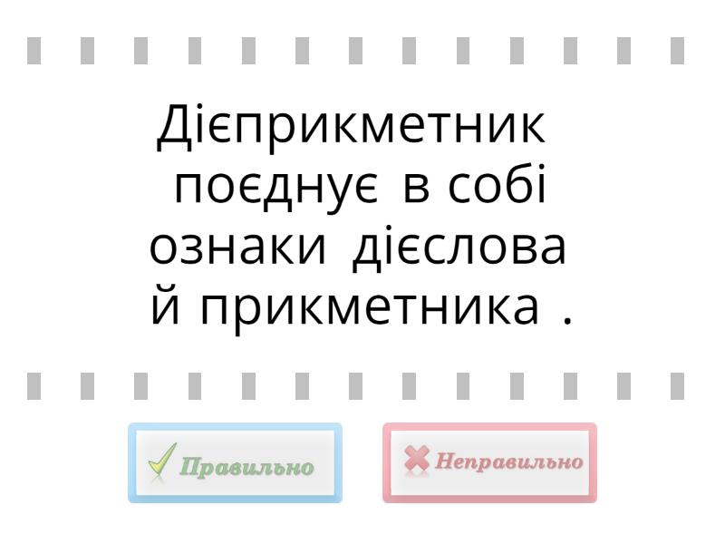 : Дієприкметник поєднує в собі ознаки дієслова й прикметника., Заплетена — це дієприкметник., Дієприкметник виражає ознаку предмета за дією або станом., Від дієслова дієприкметник узяв вид, час і здатність приєднувати залежні слова., У реченні "Він сидів біля зачинених дверей" дієприкметник виконує роль означення., Іноді дієприкметники можуть виконувати роль підмета чи додатка. , : Дієприкметник — це окрема повнозначна частина мови., Щасливий — це дієприкметник., Дієприкметник виражає дію або стан., Від прикметника дієприкметник узяв тільки запитання., У реченні "Вона сьогодні дуже втомлена" дієприкметник виконує роль означення., Дієприкметник завжди виконує роль означення.,