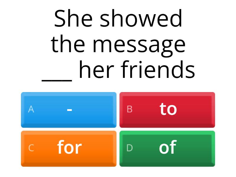 1) She showed the message ___ her friends a) - b) to c) for d) of 2) Who are ___ children over there in the garden? a) this b) these c) that d) those 3) There’s ___ sugar in this tea. It’s very sweet a) too b) too much  c) too many d) enough 4) I asked ___ about the trip next week. a) he b) him c) to him d) for him 5) He hasn’t got ___ time to make a meal. a) too b) too much c) too many d) enough 6) You’re drinking my bottle of water, not ___! a) you b) mine c) yours d) your 7) I made some lunch ___. a) you b) to you c) for you d) from you 8) I have ___ plans to change my job. I’m happy at my company. a) any b) some c) too d) no 9) Michael has a bag like this. Is this bag ___? a) him b) his c) hers d) its 10) Have you got ___ tips on how to look after plants? That will be a big help to me. a) any b) enough c) too many d) too much 11) Does that bread really ___ £2? a) spend b) rent c) offer d) cost 12) Is there any cheap ___ in the area? a) flat  b) room c) house d) accommodation 13) This umbrella is still ___ from yesterday’s rain a) wet b) full c) dry d) empty 14) The price of meat is ___ at the moment. a) spending b) costing c) renting  d) increasing 15) Can I speak to you for a ___? a) advice b) hour c) minute d) time 16) There are a lot of ___ things in the museum. a) valuable b) equal c) fair d) favourite  17) The bowl is ___ of fruit. a) heavy b) light c) full d) empty 18) We need a few ___ for dinner a) meat b) food c) minute d) carrots 19) How many ___ do you have at the moment? a) jobs b) work c) car d) transport 20) Some people like a hard bed but I prefer a ___ one. a) narrow b) light c) heavy  d) soft