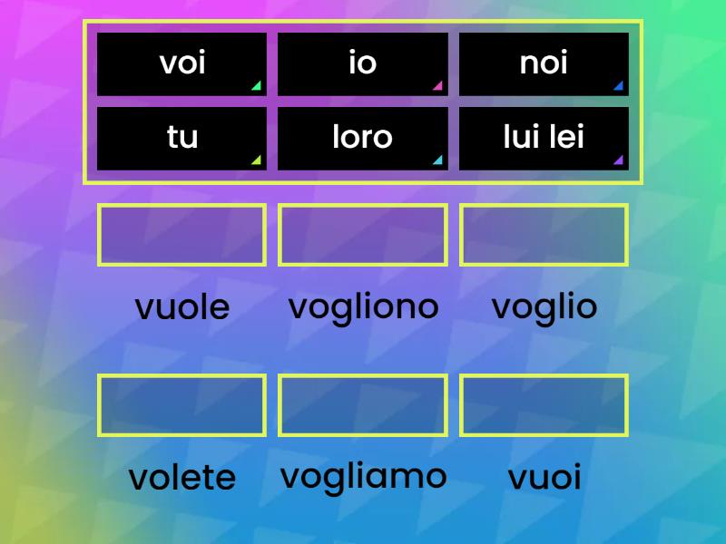 io - voglio, tu - vuoi, lui lei - vuole, noi - vogliamo, voi - volete, loro - vogliono,