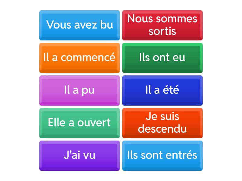 Il a été - A-t-il été?, Ils ont eu - Ont-ils eu?, Nous sommes sortis - Sommes-nous sortis?, Elle a ouvert - A-t-elle ouvert?, Ils sont entrés - Sont-ils entrés?, Je suis descendu - Suis-je descendu?, Il a commencé - A-t-il commencé?, Vous avez bu - Avez-vous bu?, Il a pu - A-t-il pu?, J'ai vu - Ai-je vu?,