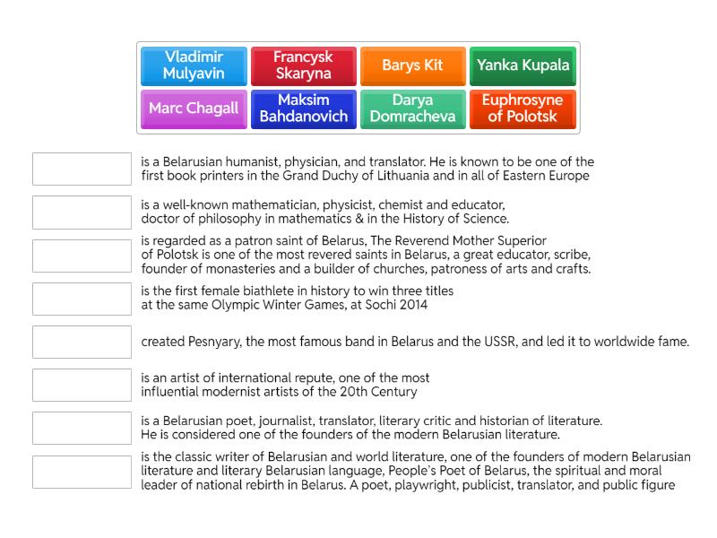 Yanka Kupala - is the classic writer of Belarusian and world literature, one of the founders of modern Belarusian literature and literary Belarusian language, People’s Poet of Belarus, the spiritual and moral leader of national rebirth in Belarus. A poet, playwright, publicist, translator, and public figure, Darya Domracheva - is the first female biathlete in history to win three titles at the same Olympic Winter Games, at Sochi 2014, Marc Chagall - is an artist of international repute, one of the most influential modernist artists of the 20th Century, Euphrosyne of Polotsk - is regarded as a patron saint of Belarus, The Reverend Mother Superior of Polotsk is one of the most revered saints in Belarus, a great educator, scribe, founder of monasteries and a builder of churches, patroness of arts and crafts., Francysk Skaryna - is a Belarusian humanist, physician, and translator. He is known to be one of the first book printers in the Grand Duchy of Lithuania and in all of Eastern Europe, Maksim Bahdanovich - is a Belarusian poet, journalist, translator, literary critic and historian of literature. He is considered one of the founders of the modern Belarusian literature., Barys Kit - is a well-known mathematician, physicist, chemist and educator, doctor of philosophy in mathematics & in the History of Science., Vladimir Mulyavin - created Pesnyary, the most famous band in Belarus and the USSR, and led it to worldwide fame.,