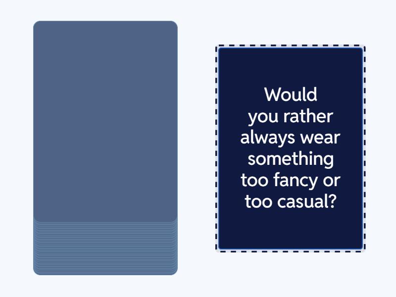 Would you prefer to live in the city or in the countryside?, Would you rather lose your wallet or your phone?, Would you choose to hear good news or bad news first?, Would you rather live without hot water or Wi-Fi?, Would you prefer to make a phone call or send a text?, Would you prefer to travel backwards or forwards in time?, Would you rather be a student or a teacher?, Would you prefer to have more time or more money?, Would you choose to receive a gift or give one?, Would you rather hold a giant spider or a giant snake?, Would you rather win $1 million or find the perfect partner?, Would you prefer to live in a very hot or a very cold country?, Would you choose to live a long and boring life or a short and exciting one?, Would you rather have no money or no friends?, Would you choose to save your own life or the lives of ten strangers?, Would you prefer to work in your home country or work abroad? , Would you rather own a cafe or a restaurant?, Would you prefer to have six dogs or six children?, Would you choose to be able to fly or read people's minds?, Would you rather lose your sight or your hearing?, Would you rather own your own boat or your own plane?, Would you rather write a best-selling book or a hit song?, Would you rather be able to swim like a dolphin or fly like a bird?, Would you rather always have perfect weather or always have weekends three days long?, Would you rather have your first child in your 20s or your 40s?, Would you rather spend a week on a snowy mountain or a sandy beach?, Would you rather have a desk job or an outdoor job?, Would you rather be able to talk with the animals or speak all foreign languages?, Would you rather have someone who cooks for you or someone who cleans for you?, Would you rather be on a cooking competition show or a reality travel show?, Would you rather have a job you love but not much money or a boring job that pays a lot?, Would you rather give up watching your favourite show or eating your favourite snack for a month?, Would you rather explore space or the ocean?, Would you rather be stuck on a train or a bus?, Would you rather be in jail for a year or lose a year off your life?, Would you rather always be 10 minutes late or always be 10 minutes early?, Would you rather live life as an average person now or as a king or queen 500 years ago?, Would you rather get free tickets for travel anywhere or never pay for food when eating out?, Would you rather read an awesome book or watch a good movie?, Would you rather win the lottery or live twice as long?, Would you rather be without internet for a week or without your phone?, Would you rather always wear something too fancy or too casual?, Would you rather always get free concert tickets or free sports event tickets?.