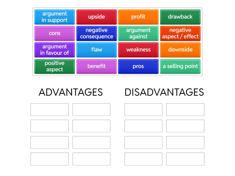 ADVANTAGES: argument in favour of, benefit , positive aspect, pros, upside, argument in support, profit, a selling point , DISADVANTAGES: argument against, cons, downside, drawback, negative aspect / effect, flaw, weakness, negative consequence ,