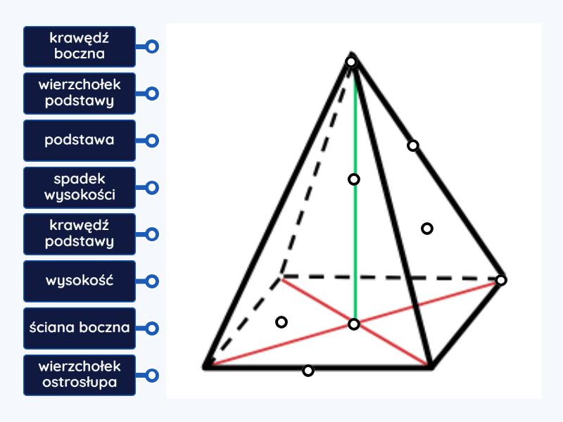 wierzchołek ostrosłupa, wysokość, krawędź boczna, ściana boczna, wierzchołek podstawy, krawędź podstawy, podstawa, spadek wysokości.