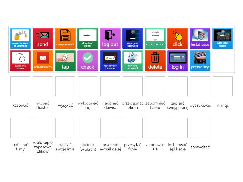 check - sprawdzać, delete - kasować, do searches - wyszukiwać, download videos - pobierać filmy, enter your password - wpisać hasło, forget your password - zapomnieć hasło, forward an e-mail - przesłać e-mail dalej, install apps - instalować aplikacje, log in - zalogować się, log out - wylogować się, make backups of your files - robić kopię zapasową plików, save your work - zapisać swoją pracę, send - wysyłać, upload videos - przesyłać filmy, swipe the screen - przeciągnąć ekran, click - kliknąć, type your name - wpisać swoje imię, tap - stuknąć (w ekran), press a key - nacisnąć klawisz,