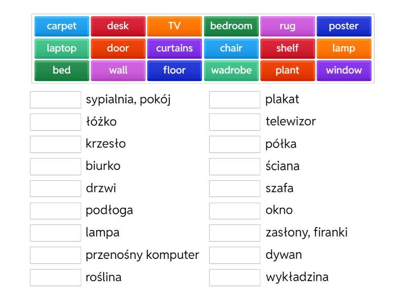 bedroom - sypialnia, pokój, bed - łóżko, chair - krzesło, desk - biurko, door - drzwi, floor - podłoga, lamp - lampa, laptop - przenośny komputer, plant - roślina, poster - plakat, TV - telewizor, shelf - półka, wall - ściana, wadrobe - szafa, window - okno, curtains - zasłony, firanki, rug - dywan, carpet - wykładzina,