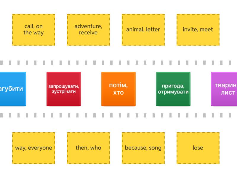 call, on the way: дзвонити/кликати, по дорозі, adventure, receive: пригода, отримувати, animal, letter: тварина, лист, invite, meet: запрошувати, зустрічати, way, everyone: шлях, усі / кожен, then, who: потім, хто, because, song: тому що, пісня, lose: загубити,