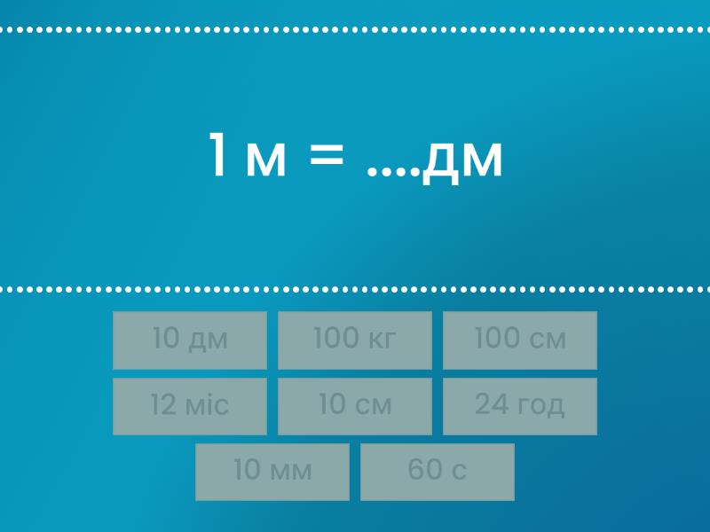 10 дм - 1 м  = ....дм, 100 кг - 1 ц = ...кг, 60 с - 1 хв = ....с, 100 см - 1 м = ....см, 24 год - 1 доба = ....год, 12 міс - 1 рік=...міс, 10 мм - 1 см=...мм, 10 см - 1 дм = ...см,
