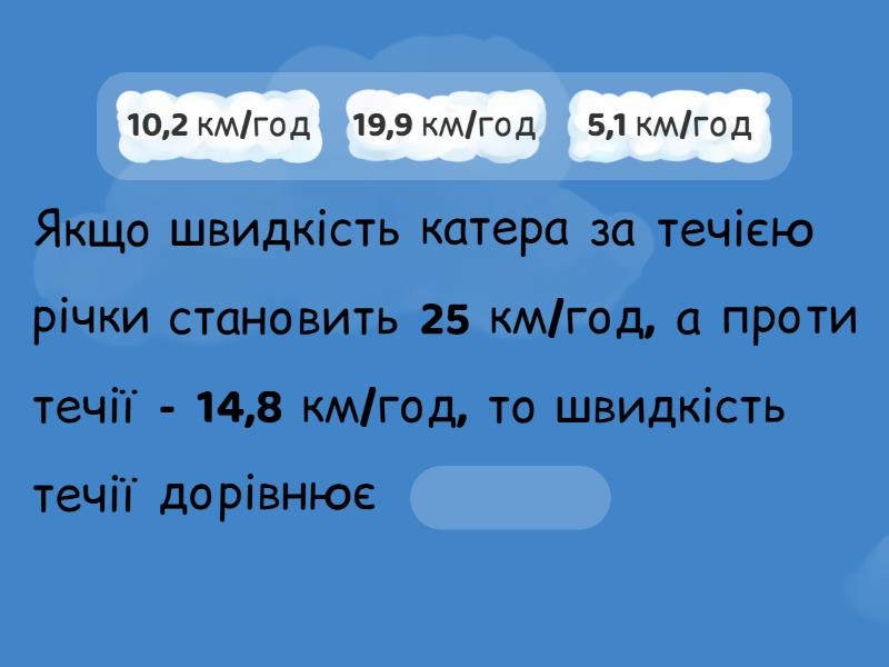 Якщо швидкість катера за течією річки становить 25 км/год, а проти течії - 14,8 км/год, то швидкість течії дорівнює ____ Якщо швидкість катера за течією річки становить 20,4 км/год і швидкість течії дорівнює 4,5 км/год, то швидкість катера проти течії становить ____ Якщо власна швидкість катера становить 16,3 км/год і швидкість річки дорівнює 4,2 км/год, то на подолання 51,25 км за течією катеру потрібно ____ Якщо власна швидкість катера становить 17,8 км/год і швидкість річки дорівнює 4,4 км/год, то рухаючись проти течії 2,75 год катер подолає ____ Якщо катер, рухаючись проти течії річки, за 3,25 год подолав 56 км 875 м і швидкість річки дорівнює 4,5 км/год, то власна швидкість катера становить ____