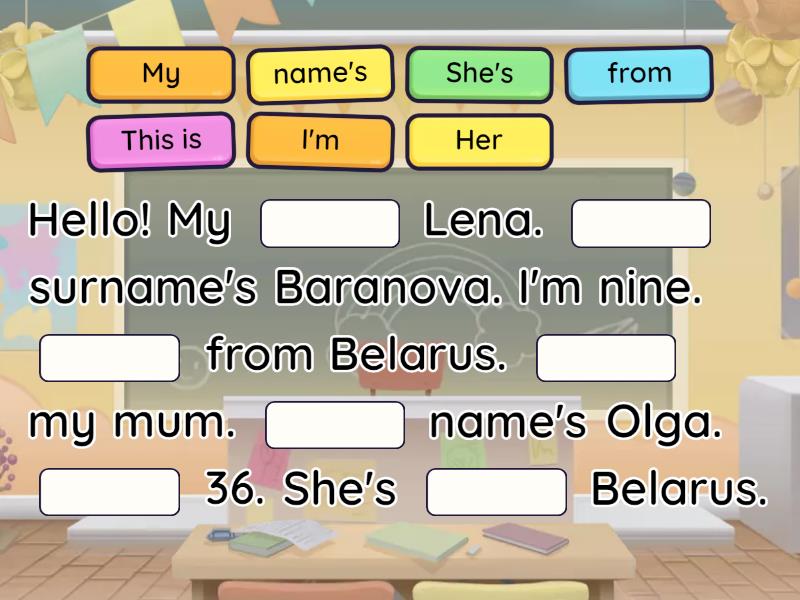 Hello! My ____ Lena. ____ surname's Baranova. I'm nine. ____ from Belarus. ____ my mum. ____ name's Olga. ____ 36. She's ____ Belarus.