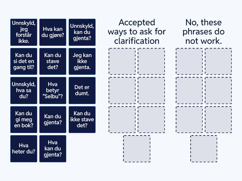 Accepted ways to ask for clarification: Unnskyld, kan du gjenta?, Kan du gjenta?, Unnskyld, jeg forstår ikke. , Kan du si det en gang til?, Unnskyld, hva sa du?, Kan du stave det?, Hva betyr "Selbu"?, No, these phrases do not work.: Det er dumt., Jeg kan ikke gjenta., Kan du gi meg en bok?, Kan du ikke stave det?, Hva kan du gjøre?, Hva kan du gjenta?, Hva heter du?,
