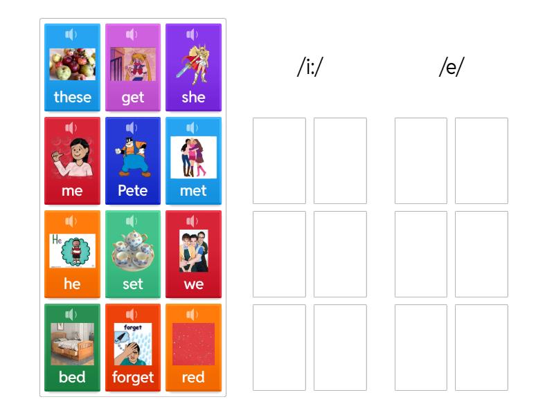 /i:/ : Pete, he, she, we, these, me, /e/ : bed, get, red, set, forget, met,