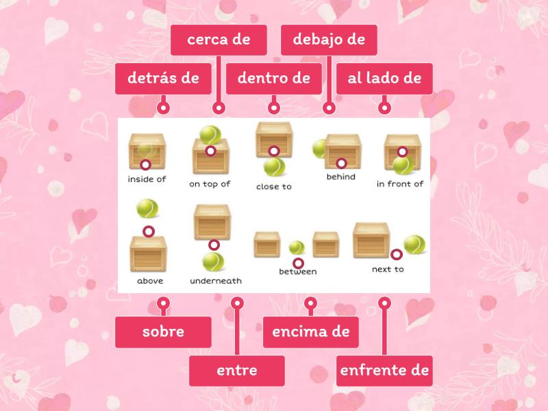 debajo de, detrás de, entre, sobre, cerca de, enfrente de, dentro de, al lado de, encima de.