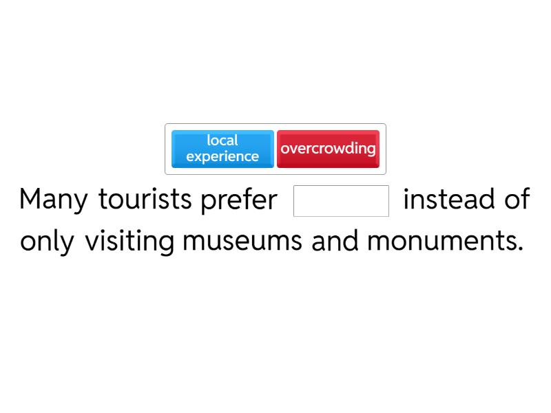 Many tourists prefer ____ instead of only visiting museums and monuments. ____ can damage the environment and make a city less attractive. If you want to reduce your ____ try taking a train instead of flying. Before going abroad, it’s important to make a ____ with your flights, hotels, and activities. Visiting small towns allows for true ____ with the community. Beaches often suffer from ____ when tourists don’t throw trash away properly.