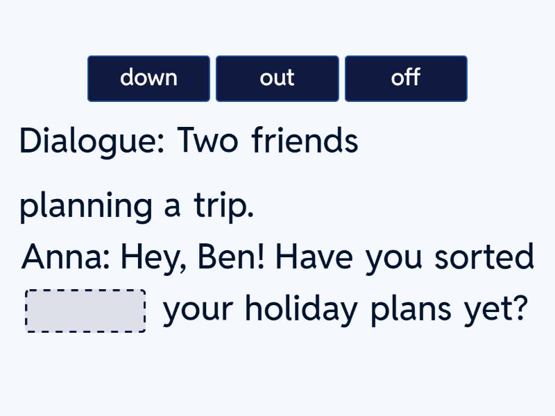 Dialogue: Two friends planning a trip. Anna: Hey, Ben! Have you sorted ____ your holiday plans yet? Ben: Not really. I’ve been meaning to, but work ____ piling up. What about you? Anna: Well, I’m thinking of ____ off for Italy next month. I want to check out some small towns, not just the tourist spots. Ben: That sounds ____ ! I’d love to tag along if that’s okay. Anna: Sure! But you’d better ____ light—we’ll be moving around a lot. Ben: Got it. I don’t want to carry a heavy suitcase anyway. By the way, are we going to book in advance or just ____ it by ear? Anna: A bit of both, I guess. We’ll map out the main route, but I’d like to go off the ____ track too. Ben: Nice! Travelling ____ that is my cup of tea. Oh, but I hope we don’t miss the boat with cheap tickets. Anna: Don’t worry, I’ve already been keeping ____ on flight prices. We should get a good deal soon. Ben: Great! Let’s do it. I can already picture us sitting in a café in Rome, just ____ up the atmosphere. Anna: Exactly! It’ll be a trip to ____. Grammar/ Vocabulary Enough of this arguing! I want you two to kiss and ____ . There is no need to rush, we've got ____ time ahead of us. That hotel is relatively near the beach but it is the ____ from the city centre. J. K. Rowling is an author who has a very creative ____. By the time we arrived at the station, the bus ____. The new musical ____ next week at 12th Street's Old Auditorium. A lot of measures ____ to fix the economy. We ____ the keys if we don't look for them. Shall we go to the beach if the weather ____ OK? We can be excited ____ the trip. How long have you been married ____ Liam? You can't help but admire her ____ to succeed. He was found guilty of ____ driving. It takes time, patience, and ____ to learn a language.